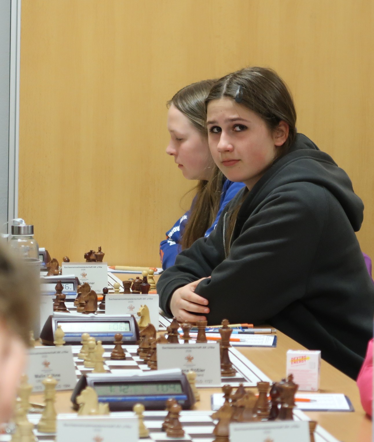 Marie gehört, wie gesagt, auch ohne Aufbau-Spielerpass einfach mit dazu und hat ja auch schon als Gastspielerin für unsere Frauenmannschaft in der Bundesliga gespielt. Das Turnier verlief sehr wechselhaft für sie. Nach zwei Auftaktsiegen folgte eine tragische Niederlage in der 3. Runde. Lange im Nachteil, dann endlich den Ausgleich erkämpft und die Partie am Ende doch noch verloren. Ein Sieg in Runde 4 und dann das Duell gegen Laura am Live-Brett. Eine gedrängte Stellung, ein Bauer weniger, viele Abtäusche, noch einen Bauern verloren. Aber dann marschiert Barry der B-Bauer los und verursacht Probleme. Und als der Staub sich legt, hat sie auf einmal zwei Bauern im Endspiel mehr, das Laura nicht mehr Remis halten kann. Ein bittersüßer Sieg – Punkt geholt, sich mit an die Spitze des Turniers gesetzt, aber damit vielleicht der Freundin im Turnier die große Hoffnung auf Turniersieg und DEM-Quali verdorben. In der nächsten Runde kam zu allem Überfluss auch noch die zweite Niederlage für Marie dazu, so dass auch die eigenen Chancen für den Turniersieg wieder schlechter standen. Bei 7 Runden im Schweizer System mit nur 11 Spielerinnen ergibt sich aber auch in der Spitzengruppe die Möglichkeit, über einen spielfreien Punkt das Tableau durcheinanderzubringen. Schon im Vorjahr erreichte in dieser Altersklasse eine Spielerin mit einer kampflosen Schlussrunde den Bronzerang. Für Marie ergab sich daher am letzten Tag neben der Möglichkeit, den Vormittag in Ruhe zum Ausräumen und spazieren zu nutzen sogar die Chance, noch den ersten Platz zu holen, wenn die beiden vor ihr liegenden Spielerinnen ihre Partien verlieren sollten. Letztlich gab es dort einen Sieg und ein Remis in schlechterer Stellung, so dass es immerhin zum 3. Platz reichte. Gratulation und höchsten Respekt!