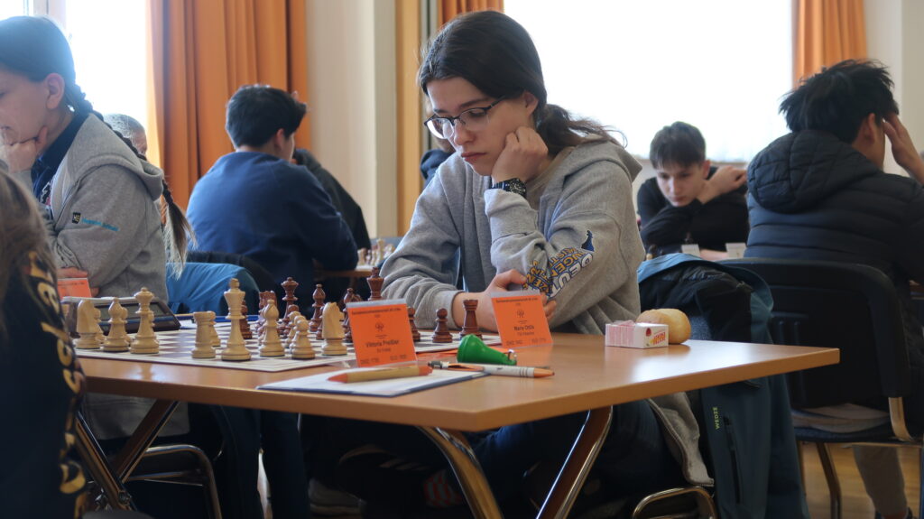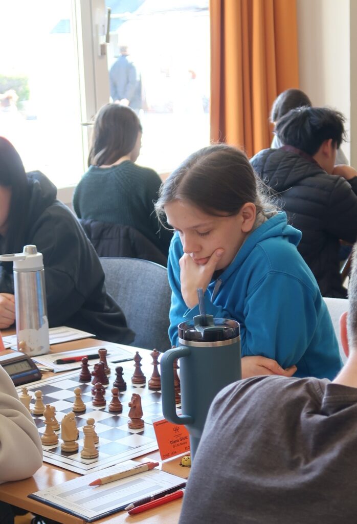 Je älter desto weiblicher, zumindest für unseren Verein in dieser Meisterschaft. Auch Dariia war – mit deutlichem Abstand von mindestens 270 DWZ-Punkten – auf dem letzten Platz gesetzt. Bei 8 Teilnehmerinnen und der Durchführung als Rundenturnier ergab sich nicht mal die Hoffnung, den stärksten Gegnerinnen aus dem Weg zu gehen. Aber wie man Dariia kennt – immer freundlich und aufgeschlossen, doch unerbittlich am Brett – ließ sie sich davon nicht entmutigen. Drei stärkeren Gegnerinnen wurde immerhin eine Punkteteilung abgetrotzt und die Basis dafür gelegt, zukünftig auch mal Siegchancen verwerten zu können.