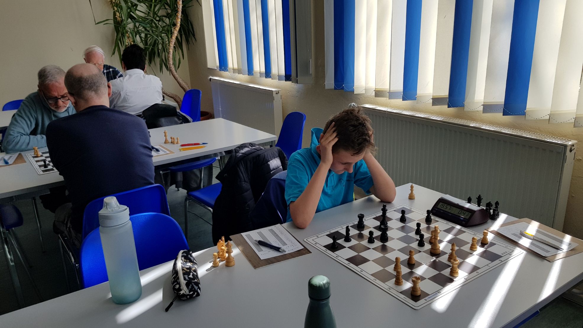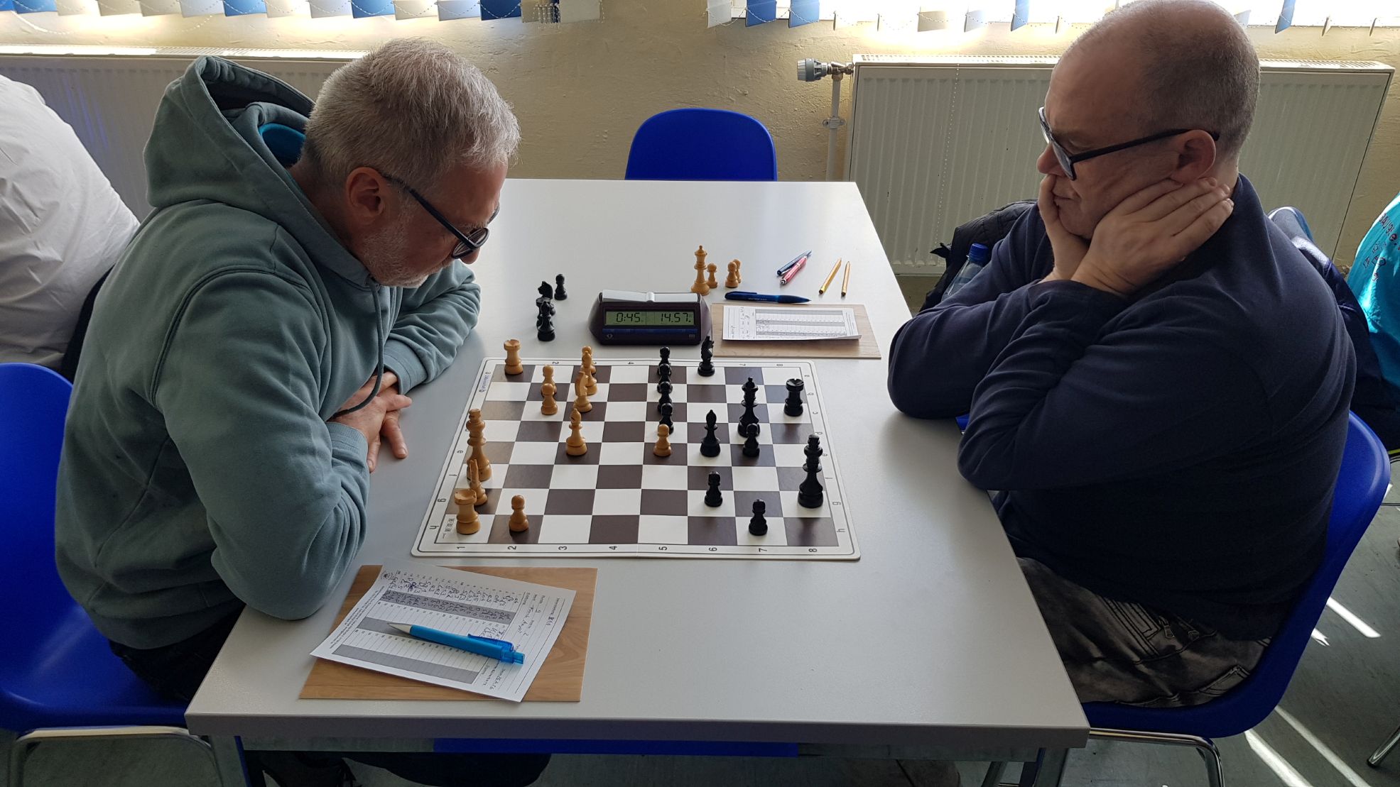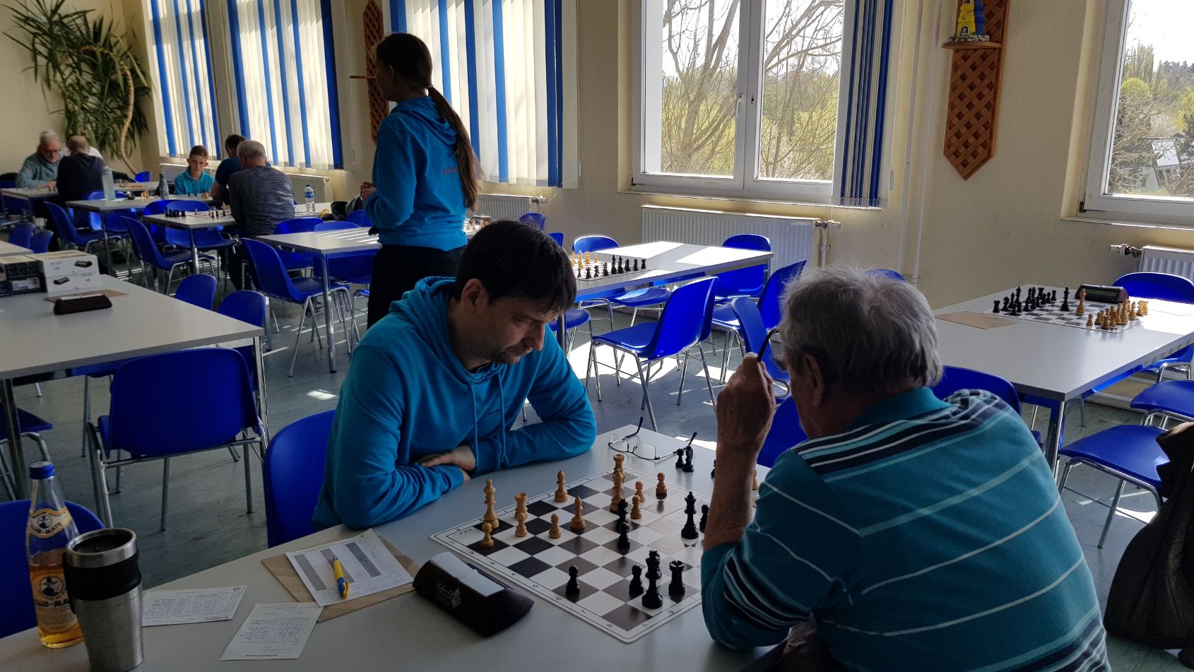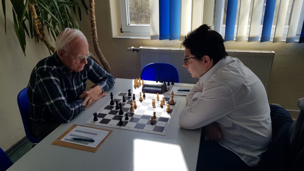 So wurde gekämpft, überall, außer bei Peter, der erneut ausgesprochen friedlich gestimmt war, was eine zügige Punkteteilung versprach. Dannys Gegner sagte zu Beginn: „falls du mir mal Remis anbieten solltest, sprich bitte deutlich, damit ich es verstehe…“, um Danny nun seinerseits permanent mit Remisanfragen zu belästigen. Danny knetete bis tief ins Endspiel, mehr als die Punkteteilung war leider nicht drin. Mathias konnte mit rettenden Springermanövern den halben Punkt klammern, da Ronald Voigt die Öse nicht fand, die den Sack zugebunden hätte. Ebenso Becky im Turmendspiel, der gegnerische König war am Marderpfahl festgetackert, Beckys Turm beherrschte das Brett. Der Sieg war theoretisch eingetütet, bis sich Becky zum fatalen Turmtausch locken ließ. Mika zuzusehen war erneut ein Vergnügen, Mika trägt fintenreiche Angriffe vor! Es gelang gegen einen geschickten Verteidiger „nur“ die Punkteteilung und immerhin das einzige Remis gegen das Oberhaus der Blumenauer. Wobei auch Frank ein opferfrohes Feuerwerk zündete, gab die Dame gegen Turm und Figuren, was lange optimistisch aussah. Aber es gelang Bert Zimmermann (der 6,5 Punkte holte und nur gegen Thomas Radke verlor) sich geschickt zu verteidigen und als sein finaler Bauernsturm begann, war die leichtfüßige Festung von Frank nicht mehr zu halten.
