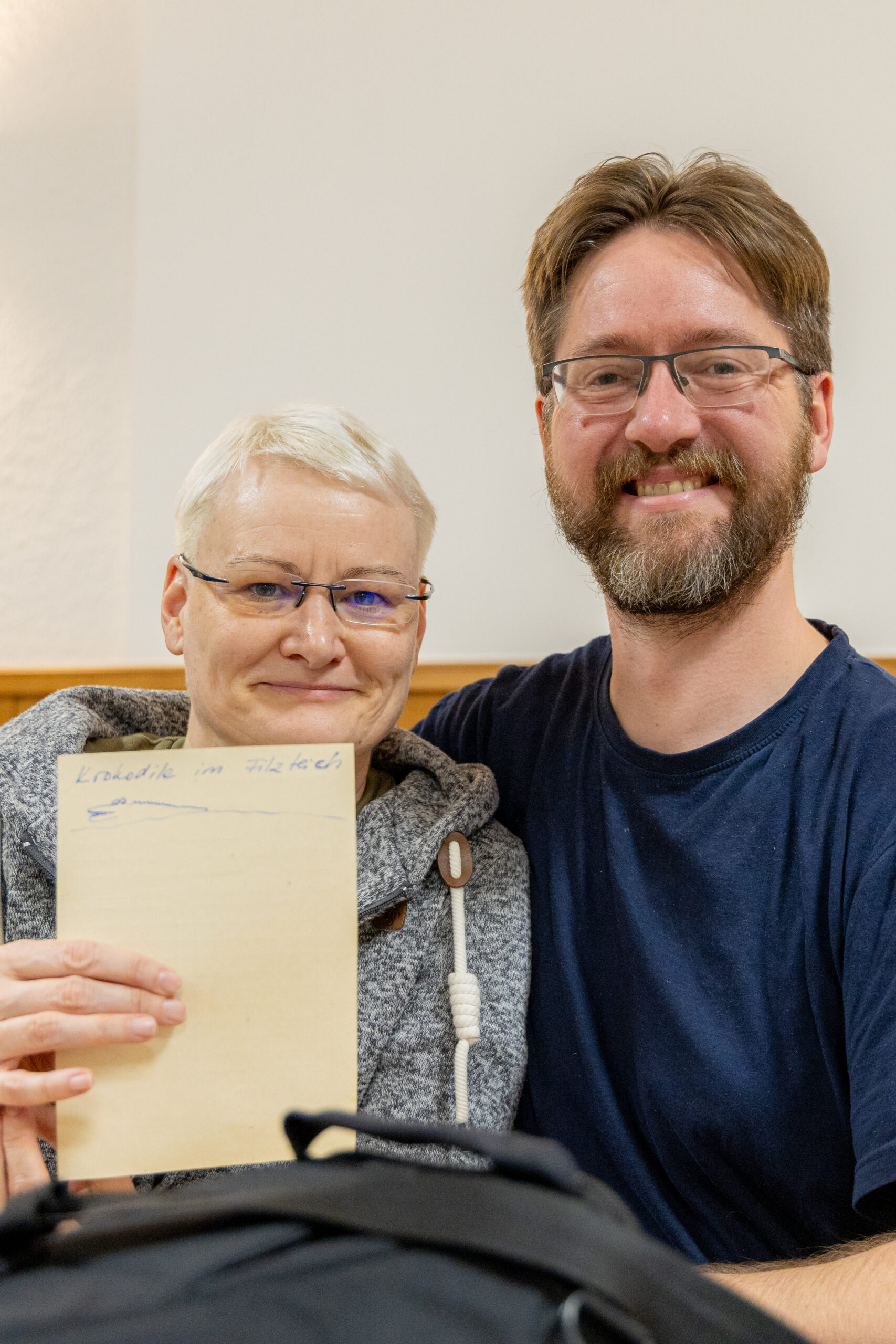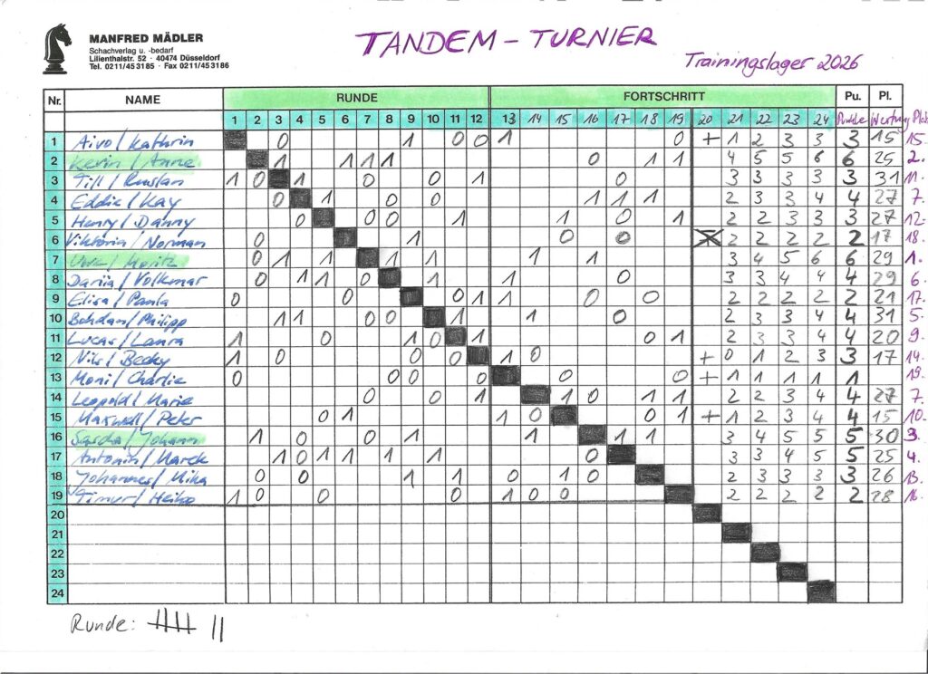 So ein Trainingslagerwochenende geht immer so schnell vorbei, weswegen das Programm prall gefüllt war. Noch am Freitagabend eröffneten Volkmar und Norman die Veranstaltung und gaben die Warnung vor den titelgebenden Krokodilen im Filzteich heraus. Die pirschen sich an nichtsahnende, nicht von Erwachsenen begleitete Kinder heran und verbieten daher den Besuch am Wasser ohne ausgewachsene Vereinsmitglieder. Danach fand das Turnier im beliebten Tandemformat statt. Die Teams wurden aus 6 nach Spielstärke sortierten Töpfen ausgelost. Kurioserweise landeten dabei alle 6 (!) Brands im Turnier in verschiedenen Teams, während 2 von 3 teilnehmenden Zielkes (Marek und Antonin) gemeinsam in einem Gespann antreten mussten. Auch hier bewies Turnierleiterin Susi den richtigen Riecher und tippte das spätere Gewinnerteam Moritz+Uwe entgegen der Bedenken anderer Trainer schon vor Turnierbeginn richtig. Silber holte das Gespann aus Kevin und Anne, Bronze ging mit Sascha und Johann an eines der Teams mit dem geringsten Altersschnitt. Den Zielke-Brothers blieb nur der undankbare, wenngleich achtbare 4. Platz.