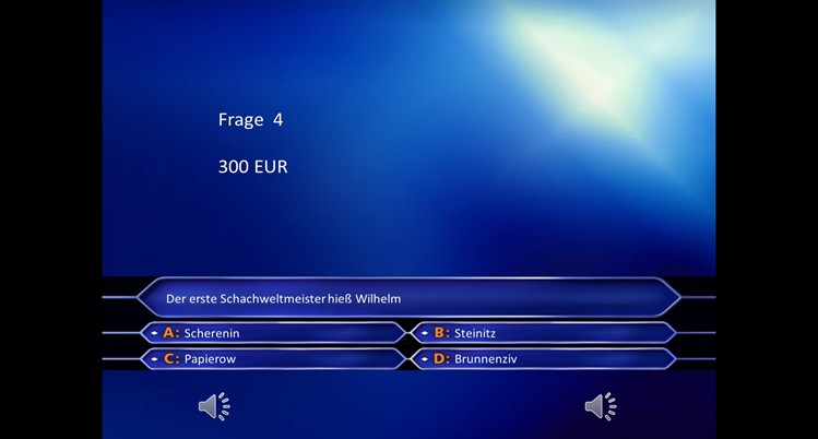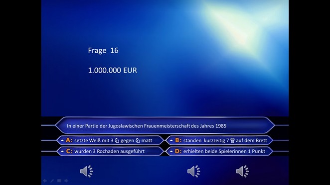 Schachliches Wissen beschränkt sich nicht auf faszinierende, wenn auch gelegentlich etwas trockene Theorie zu Eröffnungen, Taktiken und strategischen Vorteilen. Kuriose, nachgerade abwegige und teilweise nicht ganz ernstgemeinte Fragen wurden Samstagabend im Quizformat gestellt. Nach dem Motto „Besser gut geklaut als schlecht erfunden“ wurde das Konzept der Fernsehsendung „Wer wird Millionär“ adaptiert, durch die Sendung führte der beliebte Moderator Norman Jauch. Die Rateteams bekamen bekannte oder neu ersonnene Joker, die strategisch eingesetzt werden sollten – damit man nicht wie Martin und Uwe am Ende mit 3 Jokern auf dem Konto auf der 500-EUR-Stufe ausscheidet.