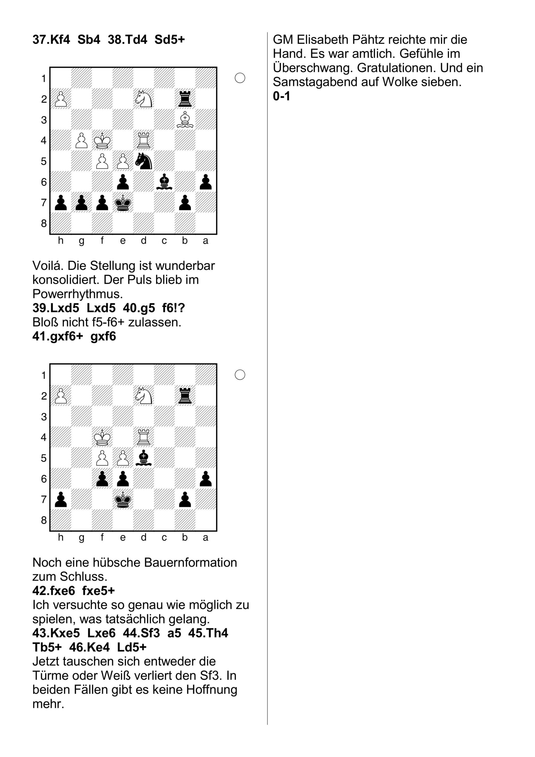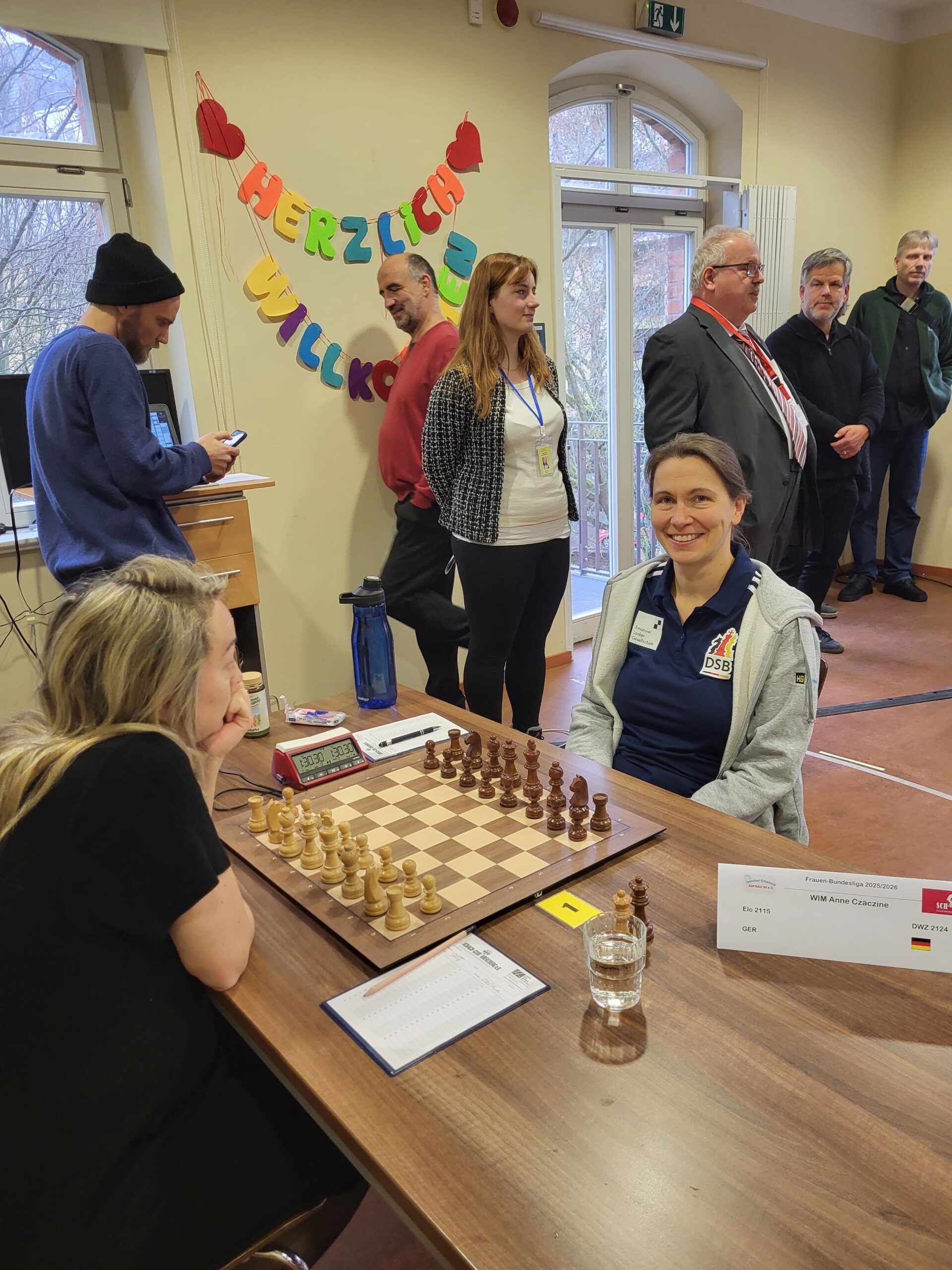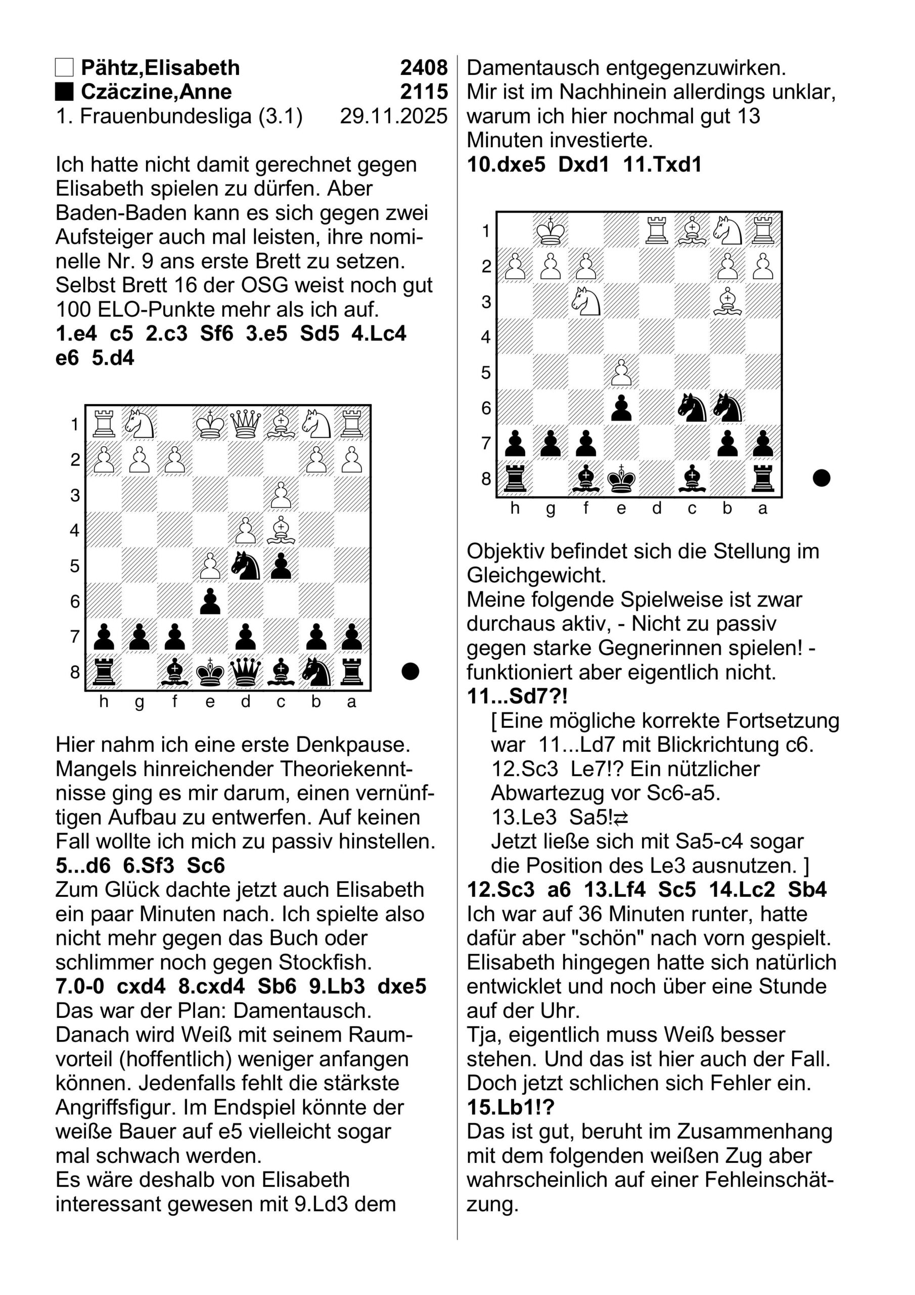 Nun, 26 Jahre später, spielten wir unsere erste Partie mit klassischer Bedenkzeit: Berlin, 29.11.2025, 1. Frauenbundesliga, Brett 1. GM Päthz mit kugeligem Babybauch, ich mit meinen zwei Töchtern als Mannschaftskameradinnen. Die Zeit rennt. Und dann, wenn man es gar nicht mehr erwartet, hält sie plötzlich das schachliche Highlight schlechthin bereit. Jedenfalls für mich.