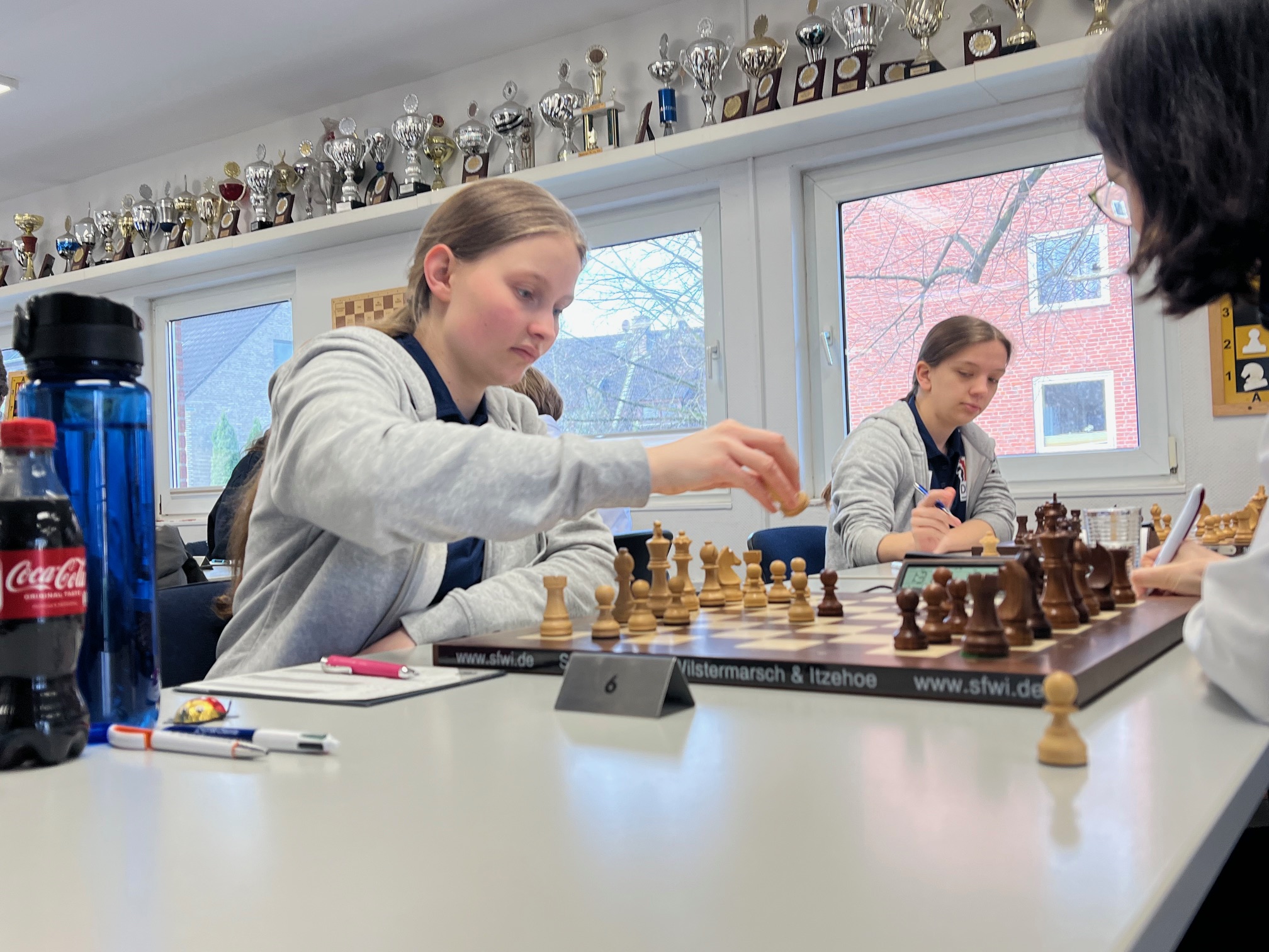 Nach 3 Stunden hörte ich hinter mir, wie die Figuren wieder aufs Brett gestellt wurden. Laura war fertig. Als ich mich suchend umschaute, wie die Partie ausgegangen war, zeigte mir ein Hamburger Kiebitz den Daumen nach oben mit anerkennendem Nicken: Punkt für uns. Laura hatte ihre Gegnerin überspielt. In Lichess-Sprache: 96% Genauigkeit und nur eine Ungenauigkeit. Saubere Leistung. Das ging ja sehr gut los.